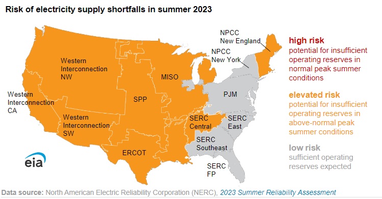 Según el NERC, las 20 áreas de evaluación del NERC disponen este año de recursos energéticos suficientes para satisfacer la demanda máxima normal de verano. Sin embargo, algunas zonas de evaluación corren un riesgo elevado de escasez de suministro eléctrico si se enfrentan a condiciones estivales más extremas. Se trata de la Interconexión Occidental de EEUU, SPP, MISO, ERCOT, SERC-Central y Nueva Inglaterra.