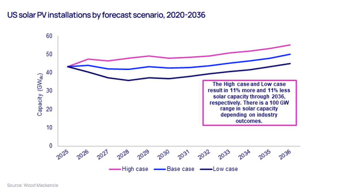 Las previsiones del informe incluyen distintos escenarios que muestran cómo los cambios políticos podrían afectar al mercado solar. La orientación final sobre las disposiciones relativas a entidades extranjeras de preocupación, el resultado de acciones comerciales pendientes y la capacidad de los proyectos para obtener permisos determinarán cuánta capacidad solar llegará finalmente a ponerse en marcha. En particular, el sector residencial está afrontando dificultades debido a cambios en la política fiscal en 2025.