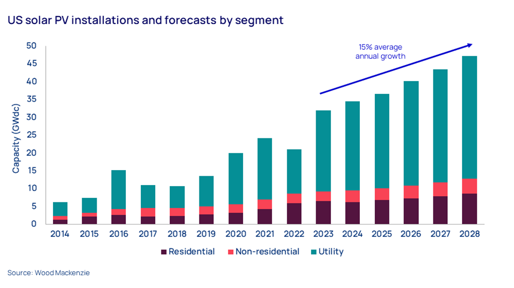El mercado solar se ha visto obstaculizado en los últimos años por los retos de la cadena de suministro provocados por la pandemia COVID-19 y agravados por una política comercial restrictiva. Estos problemas están empezando a remitir y, a medida que se afianzan las políticas de la Ley de Reducción de la Inflación (IRA), Wood Mackenzie prevé que la capacidad solar operativa total pase de los 153 GW actuales a 375 GW en 2028.