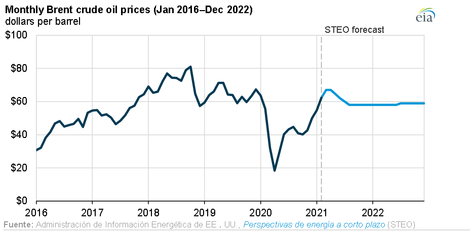 En su Perspectiva de energía a corto plazo de marzo (STEO), la Administración de Información de Energía de EEUU (EIA) espera que los precios del petróleo crudo Brent promedien $ 64 por barril (b) en el segundo trimestre de 2021 y luego caigan a menos de $ 60 / b a través del finales de 2022. Los precios más altos del petróleo crudo en marzo y abril son principalmente el resultado de una menor producción de petróleo crudo de los miembros de la Organización de Países Exportadores de Petróleo (OPEP) y países socios (OPEP +), como se anunció en su reunión del 4 de marzo .