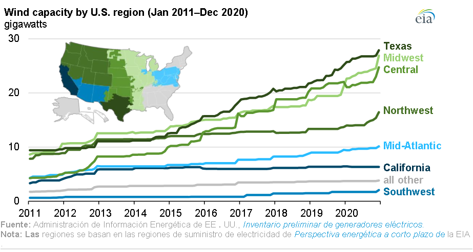 Las regiones de Texas, Medio Oeste y Central, hogar de algunos de los recursos eólicos más prolíficos del país, en conjunto representaron la mayor parte del crecimiento de la capacidad eólica de EEUU de 2011 a 2020 con un 73% de las adiciones. A principios de 2011, la región de Texas (que cubre el área servida por ERCOT ) tenía 9,4 GW de capacidad eólica; a finales de 2020, la capacidad había aumentado a 27,9 GW. La capacidad eólica en la región del Medio Oeste se triplicó, pasando de 8,6 GW en 2011 a 26,9 GW en 2020. En 2011, la región Central tenía aproximadamente la mitad de la capacidad eólica de las regiones de Texas y Medio Oeste. Después de agregar más capacidad eólica (20,5 GW) en la última década que cualquier otra región, la región central es ahora una de las principales regiones de capacidad eólica de EEUU.