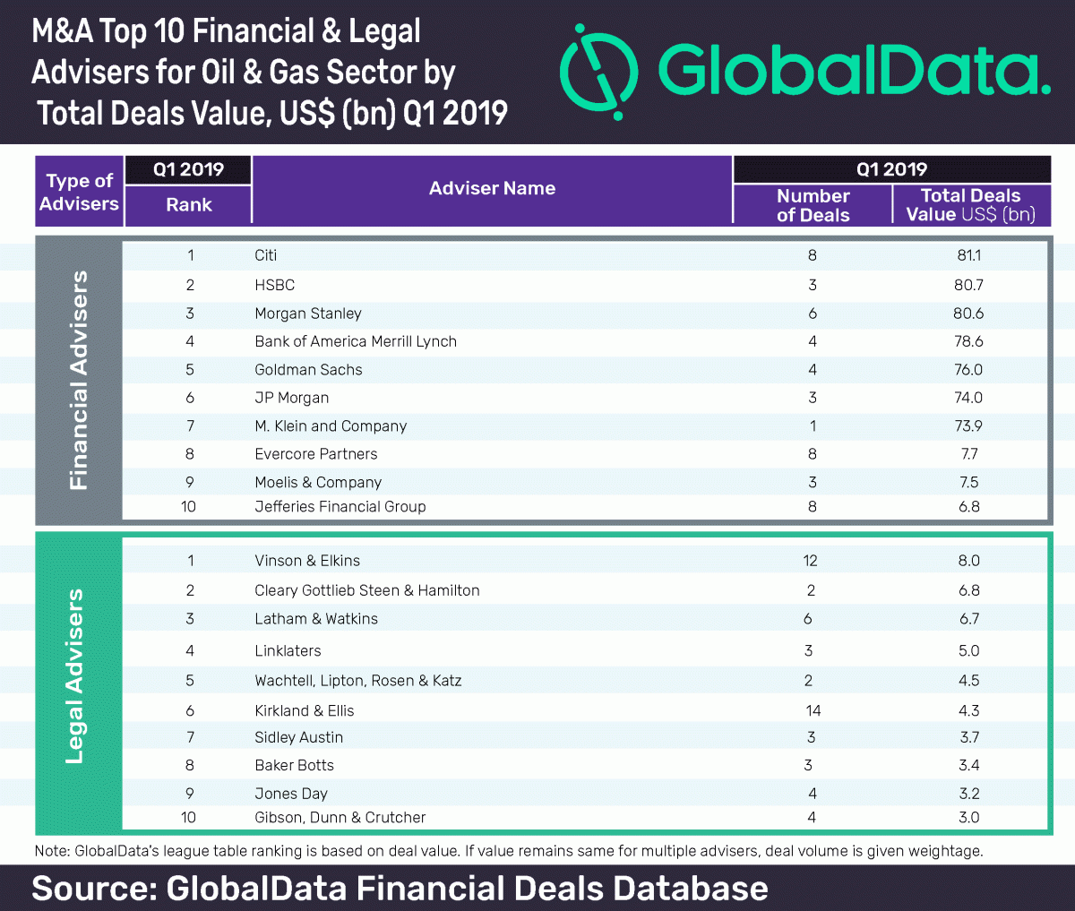 Citi ha mantenido la primera posición en la última tabla de la liga de fusiones y adquisiciones (M&A) de los 10 asesores financieros principales para el sector de petróleo y gas por valor de los acuerdos en el primer trimestre de 2019, según la firma de análisis y datos GlobalData.