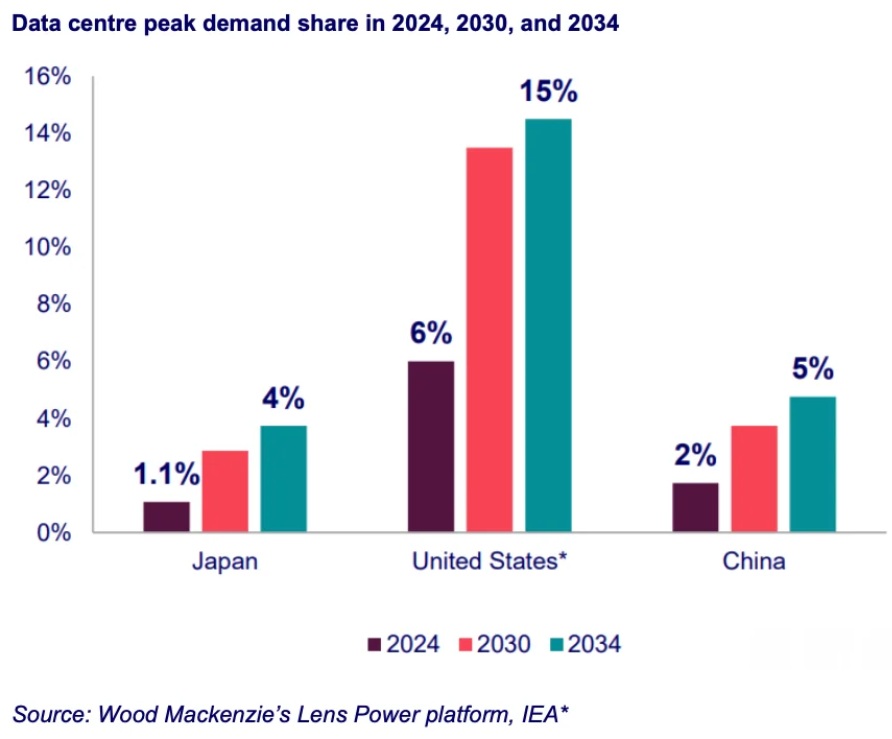 “A pesar del crecimiento constante en las inversiones de hyperscalers en Japón, los centros de datos representan una proporción significativamente menor de la demanda energética en comparación con los referentes internacionales”, afirmó Naomi Oshita, asociada de investigación en energía y renovables para Asia-Pacífico en Wood Mackenzie. “Proyectamos que los centros de datos en Japón representarán alrededor del 4 al 5% de la demanda máxima para 2034, muy por debajo de Estados Unidos, donde la demanda máxima de los centros de datos podría alcanzar hasta un 15% en el mismo período”.
