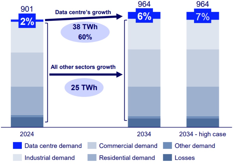 El informe de Wood Mackenzie, “La fiebre del oro de los centros de datos en Japón: la batalla por alimentar un futuro basado en datos”, proyecta que el consumo eléctrico más que se triplicará, pasando de 19 TWh (teravatios hora) en 2024 a entre 57 y 66 TWh en 2034. Se espera que la demanda máxima de los centros de datos alcance entre 6,6 y 7,7 GW (gigavatios) en 2034, lo que equivaldría al 4% de la carga máxima total de Japón y representaría un aumento de tres veces respecto a los niveles de 2024.