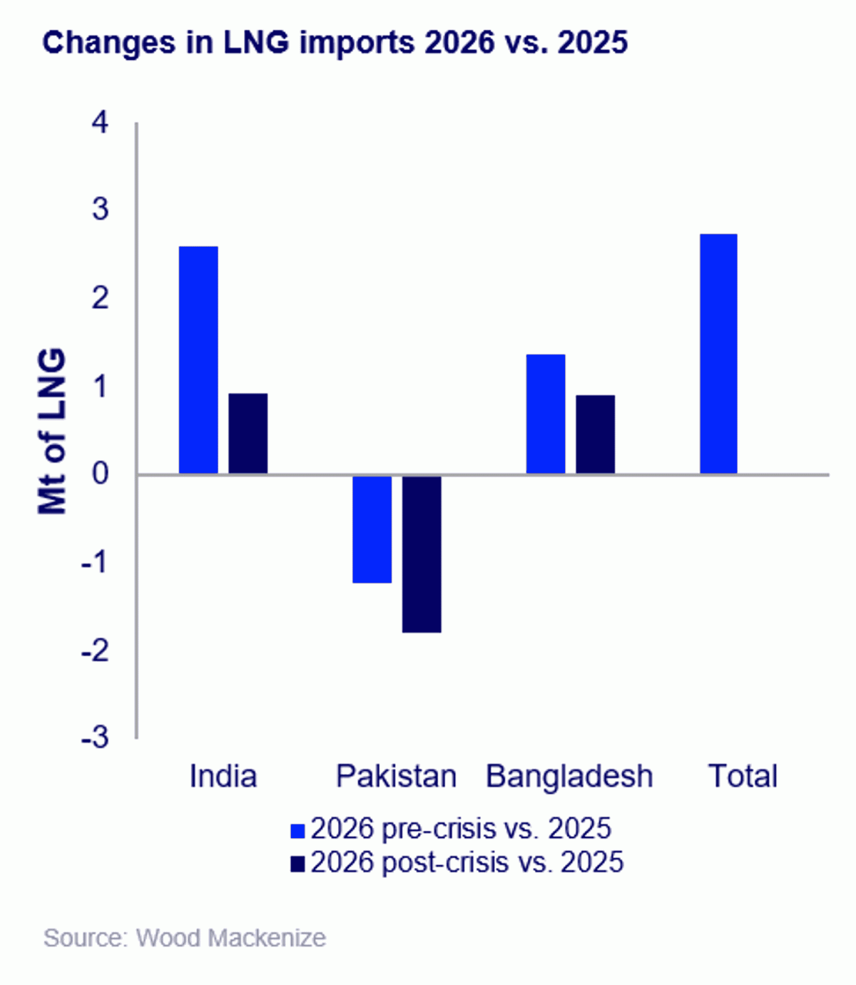 Wood Mackenzie cree que la demanda de GNL en el sur de Asia podría ser entre 2 y 3 millones de toneladas (Mt) menor hasta el tercer trimestre de 2026, lo que obligaría a afrontar mayores costes energéticos y racionamiento industrial