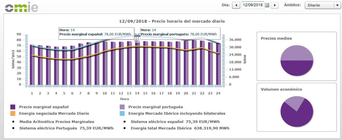 Este miércoles el precio de la electricidad se ha ido hasta los 75,39 euros MWh, un precio que es 81 céntimos más caro que el anterior récord, de 74,58 €/MWh que se registró el pasado día 5.