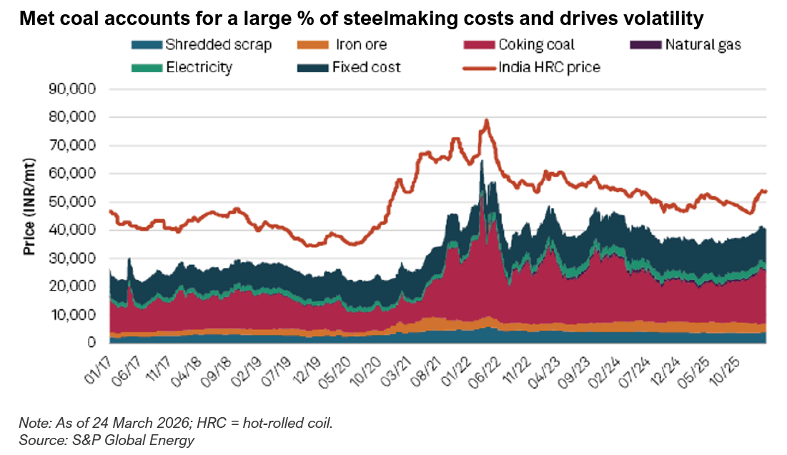 Para los productores, lo importante es el coste final entregado. S&P Global indica que los costes de transporte han aumentado notablemente, elevando el coste del carbón y del mineral de hierro, lo que ha llevado a subir los precios del acero en India.