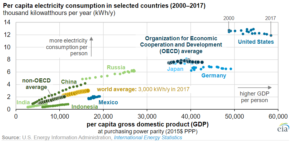 En Estados Unidos, el consumo total de electricidad ha aumentado ligeramente desde principios de la década de 2000, pero el consumo de electricidad por persona disminuyó en casi un 7% entre 2000 y 2017 debido a las mejoras en la eficiencia energética y los cambios en la economía que han resultado en un menor uso de electricidad por unidad del producto económico (medido por el producto interno bruto o PIB).