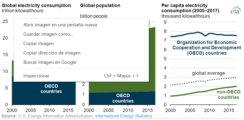 El consumo mundial de electricidad continúa aumentando más rápido que la población mundial, lo que lleva a un aumento del consumo de electricidad per cápita, según las estadísticas internacionales de energía de la Administración de Información de Energía de EEUU (EIA).