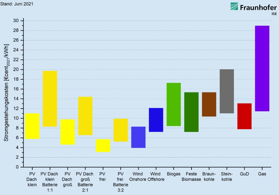 Como resultado de los esfuerzos intensificados para proteger el clima, por un lado, los costos de operación de las centrales eléctricas convencionales están aumentando; por otro lado, los costos de producción de electricidad de las centrales fotovoltaicas en particular han disminuido aún más en comparación con el último estudio realizado en 2018. Actualmente, dependiendo del tipo de sistema y de la irradiación solar, los sistemas fotovoltaicos generan costes de producción de electricidad entre 3,12 y 11,01 céntimos de € / kWh. Los costes específicos del sistema oscilan entre 530 y 1.600 € / kWp, según el tipo de sistema.