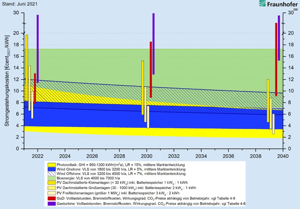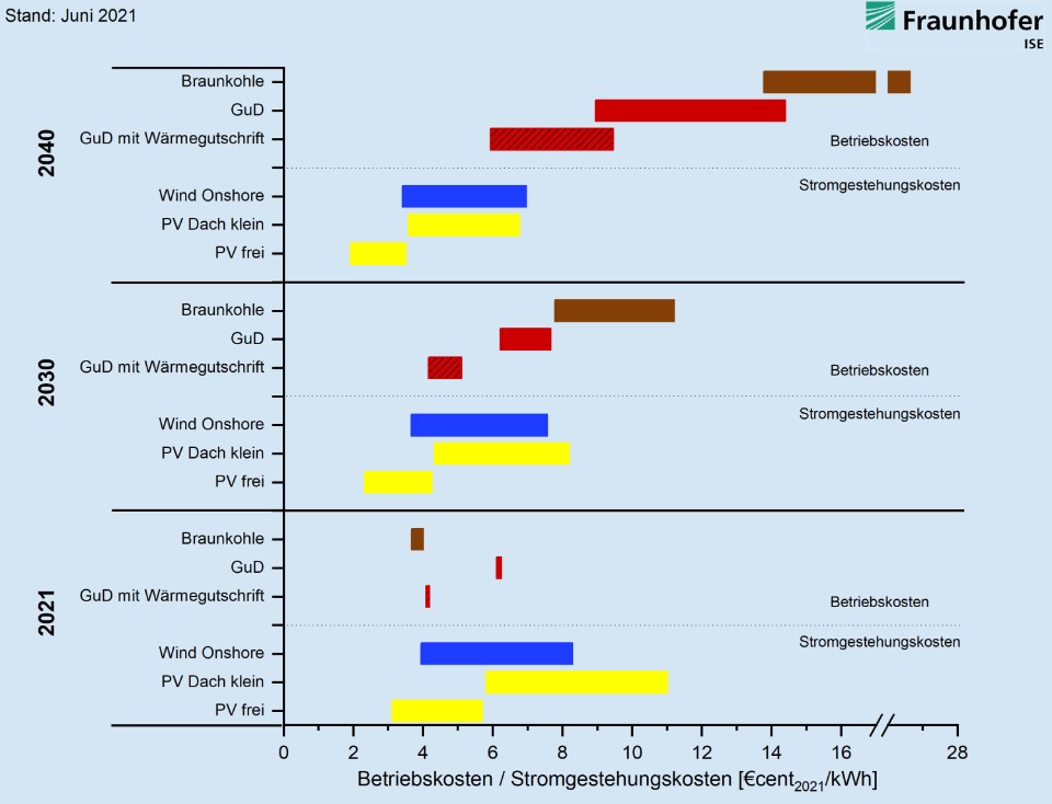 El equipo de investigación de Fraunhofer ISE también compara los costos de producción de electricidad de las nuevas centrales eléctricas de energía renovable con los costos operativos de las centrales eléctricas convencionales existentes. Resulta que en 2021 los costos de producción de electricidad de las energías renovables estarán al nivel de los costos operativos de las centrales eléctricas convencionales, si no más bajos.