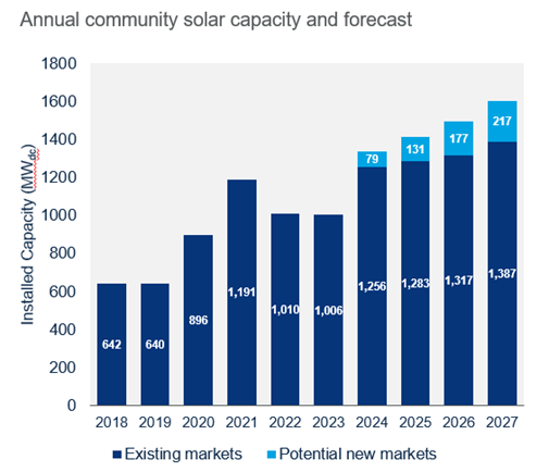 El nuevo objetivo de CCSA de 30 gigavatios (GW) de energía solar comunitaria para 2030, anunciado en enero de 2023, requerirá una aceleración de la capacidad instalada en los mercados existentes y el establecimiento continuo de nuevos mercados estatales. Las previsiones actuales de Wood Mackenzie, basadas en los mercados existentes y en una previsión conservadora de nuevas oportunidades de mercado, muestran que se espera instalar 11,5 GWdc de energía solar comunitaria para 2027.