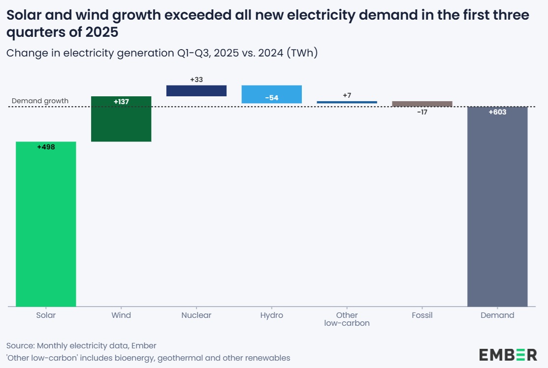 En los tres primeros trimestres de 2025, la generación solar aumentó en 498 TWh (+31%) y ya superó la producción solar total de todo 2024. La generación eólica creció en 137 TWh (+7,6%). En conjunto, aportaron 635 TWh, superando el aumento de la demanda mundial de electricidad de 603 TWh (+2,7%).
