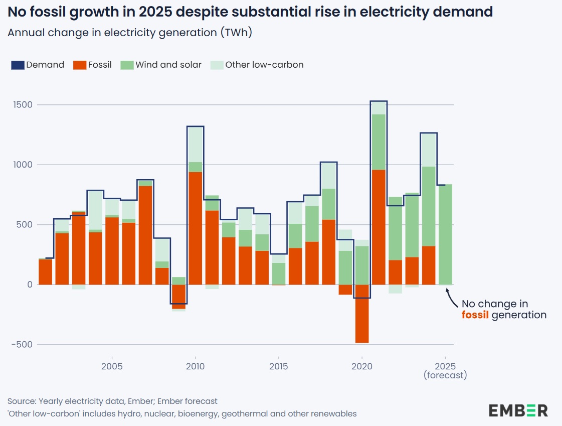 Este auge de las energías limpias deja paralizada la generación de energía fósil. La generación de energía fósil disminuyó ligeramente un 0,1 % (-17 TWh) en los tres primeros trimestres de 2025. Ember prevé que no habrá crecimiento en la generación de energía fósil para todo el año 2025, lo que supone la primera vez desde la pandemia de la COVID-19 que la energía fósil no habrá aumentado a pesar de la creciente demanda de electricidad.