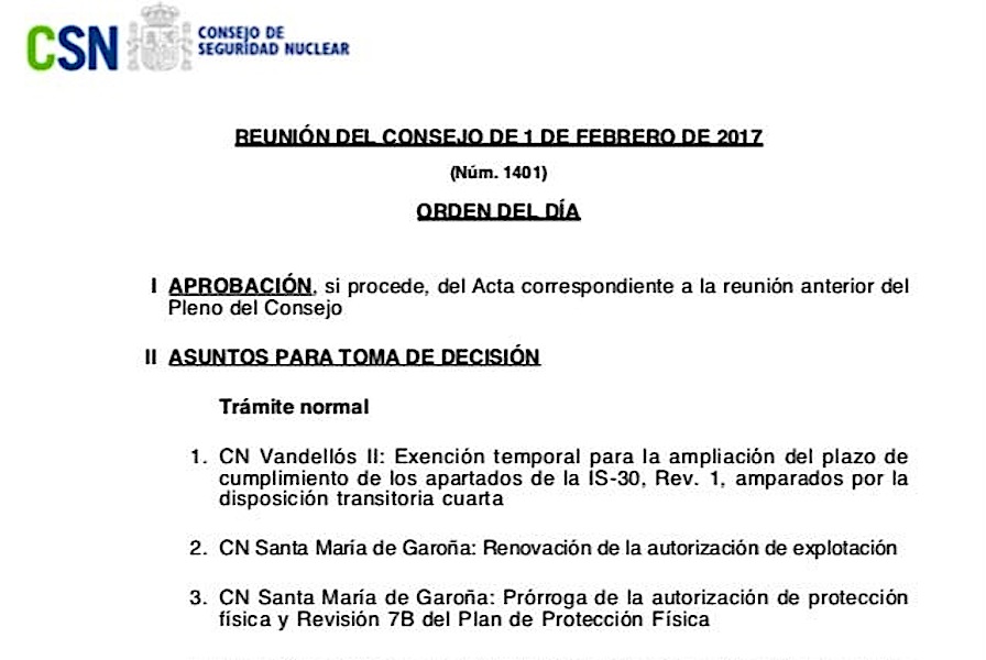 Orden del día del CSN para el Pleno del 1 de febrero de 2017