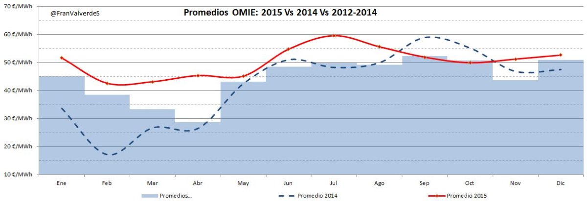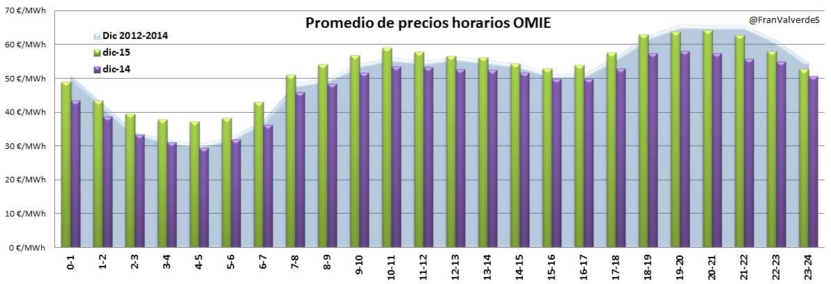La subida con respecto a Noviembre ha sido de un 2,8% y con respecto al mismo mes de 2014 de un 10,8%. En Julio ya parecía claro que OMIE podría terminar por encima de los 50 €/MWh y desde luego la previsión se ha cumplido: el global del año ha quedado en 50,32 €/MWh siendo el 2º precio más caro de la historia de OMIE, tras remontarnos en los años hasta el 2008 donde se fijó en 64,43 €. 2015 ha subido con respecto a 2014 nada menos que un 19,4%. Curiosamente, las horas que más han subido en este mes han sido las de menor demanda, esto es, la madrugada y en menor medida hasta el mediodía, el resto han estado prácticamente en la media de los 3 últimos años: