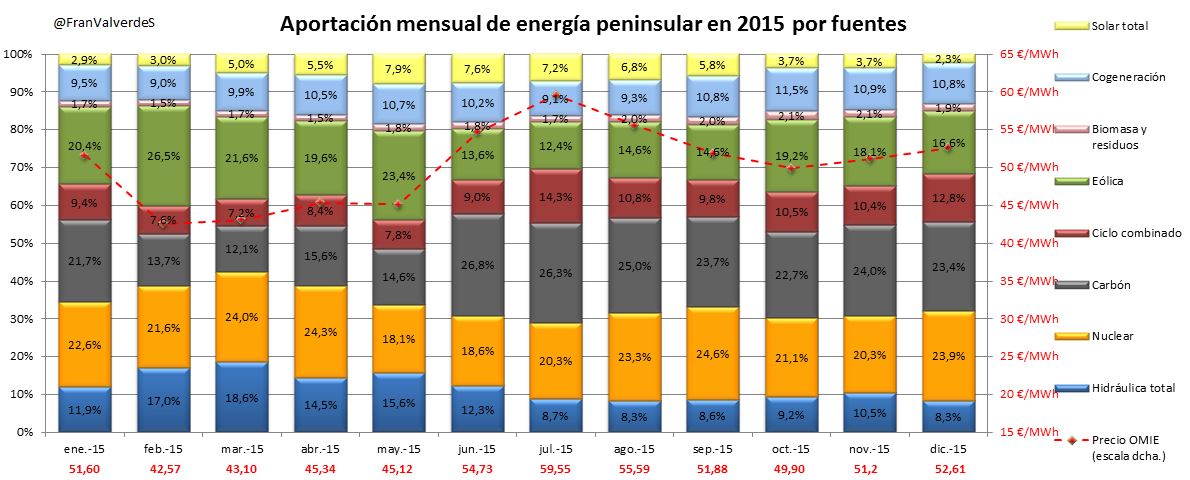 En el global del año vemos que las 3 principales fuentes de generación han sido (por orden): Nuclear, Carbón y Eólica, estas dos últimas intercambiando posiciones con respecto al 2014: