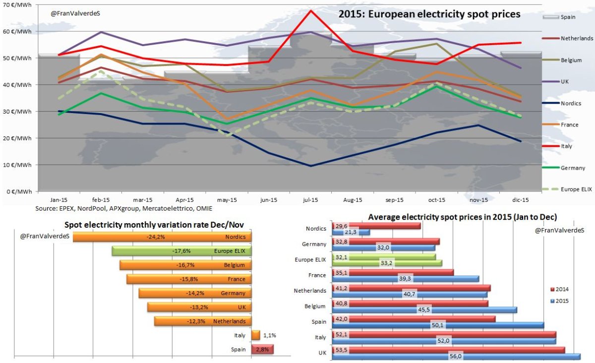 ¿Adivinan cuál fue el país/región europea donde más subió en diciembre el precio del mercado mayorista de la electricidad? Pues efectivamente, mientras en la inmensa mayoría de países la electricidad bajaba, en Italia y sobre todo España, la electricidad subía...