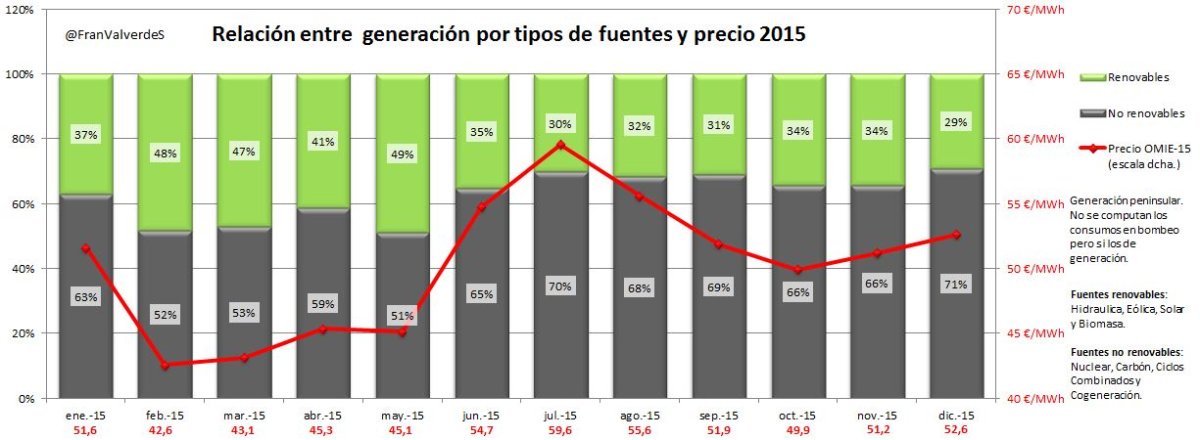 El pasado 2015 hubo un retroceso muy importante en la producción con agua, de casi un 27% y en mucha menor medida de la eólica (-3,3%). Por el lado opuesto, el carbón (la fuente más contaminante) y ciclos combinados tuvieron un importante incremento en su producción (un 25% y un 16% respectivamente). Estas variaciones han provocado un retroceso en la generación renovable de casi 6 puntos con respecto al año pasado, quedando en un 37%. La proporción de generación renovable a lo largo del año es la siguiente: