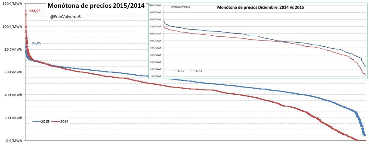 La hora más cara del año, 85,05 €/MWh la encontramos el 7 de enero de 10 a 11h, El suelo del mercado este año no ha sido 0 €, quedando la hora más barata en 4€. Este valor se ha alcanzado varias veces en días diferentes, el primero de ellos fue el 31 de enero de 1 a 6 de la madrugada. En estos primeros días de 2016 ya se han casado horas a bastante menor precio, lo que es un buen presagio para el año en curso...
