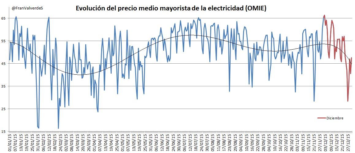 Curioso comportamiento el de este diciembre: la primera semana disparado como un cohete, para perder fuelle las dos siguientes y por último, coincidiendo con la entrada de vientos de la última, bajando en picado. Al final ha cerrado en 52,61 €/MWh y ha sido uno de los diciembres más caros de la historia (tras los de 2013, 2008 y 2007). Este mismo título se lo llevaron los meses de Enero, Junio, Julio, Agosto y Noviembre (aunque a Abril y Mayo les faltó poco en conseguirlo):