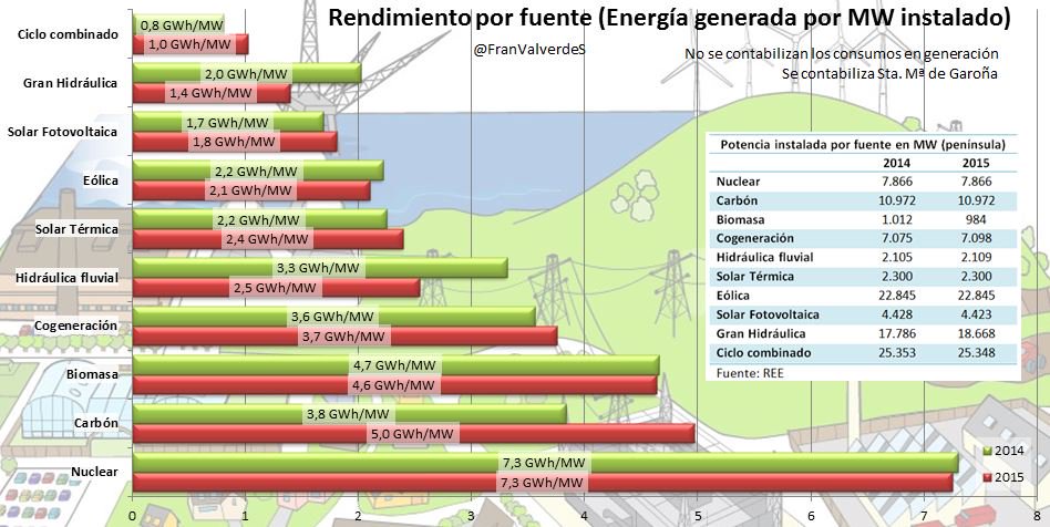 Las variaciones con respecto al año pasado están provocadas por la mayor o menor generación con una fuente determinada, o por la modificación de la potencia instalada. Lo primero que nos choca es lo poco que se genera con los ciclos, la fuente que más potencia hay instalada (25,3 GW), viéndose claramente el derroche económico que esto supone y que estamos pagando todos. Otra conclusión que podemos obtener es que de las fuentes renovables, la biomasa es la que más produce por MW instalado y en el 2015 fue la gran hidráulica la que menos. O como la termosolar es más eficiente que la eólica o la fotovoltaica.