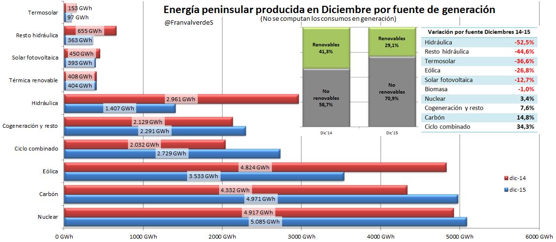 Este diciembre, las 3 fuentes que más han producido han sido la Nuclear, Carbón y Eólica. Con respecto al mes pasado, el carbón cede el primer puesto a la nuclear y la eólica permanece como 3ª fuente. Con respecto a diciembre del 2014, el carbón adelanta a la eólica: