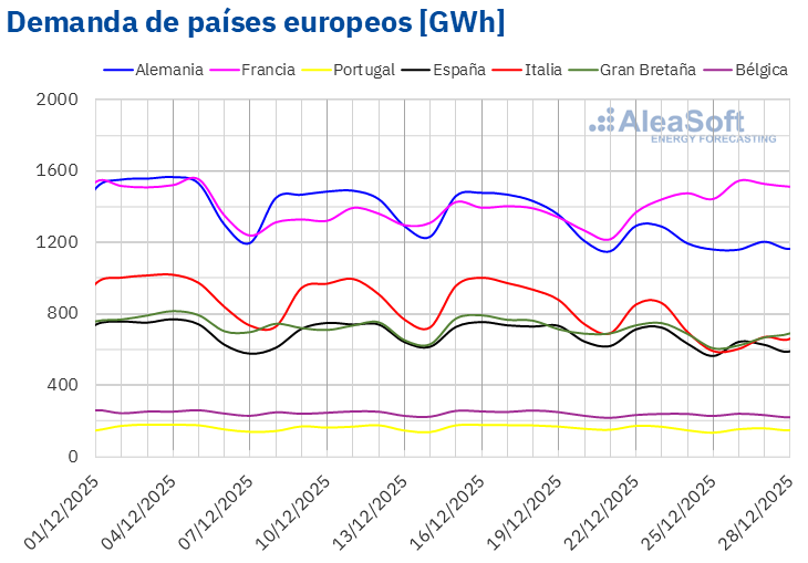 Para la semana del 29 de diciembre, según las previsiones de demanda de AleaSoft Energy Forecasting, la tendencia negativa se invertirá y la demanda aumentará en los mercados alemán, español, británico, belga y francés. Sin embargo, la demanda seguirá disminuyendo en los mercados italiano y portugués.