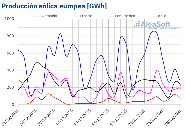 En la semana del 29 de diciembre, según las previsiones de producción eólica de AleaSoft Energy Forecasting, la producción con esta tecnología aumentará en los mercados alemán e italiano. Por el contrario, se espera que disminuya en los mercados español, francés y portugués.