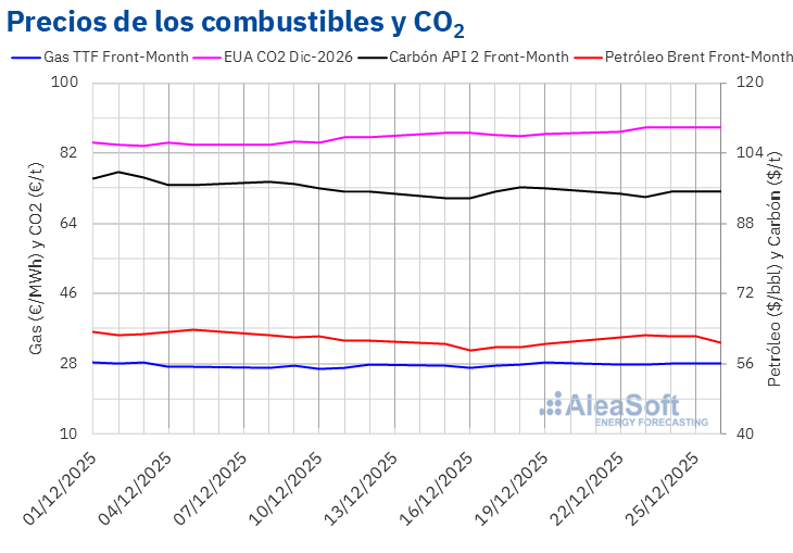 En cuanto a los futuros de gas TTF en el mercado ICE para el FrontMonth, el lunes 22 de diciembre registraron su precio de cierre mínimo semanal, de 27,69 €/MWh. Posteriormente los precios aumentaron. El 24 y el 26 de diciembre, estos futuros alcanzaron su precio de cierre máximo semanal, de 28,10 €/MWh. Sin embargo, según los datos analizados en AleaSoft Energy Forecasting, este precio todavía fue un 0,2% menor al del viernes anterior.
