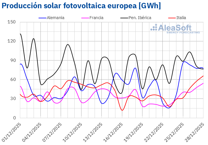 Los mercados alemán, italiano y francés marcaron un nuevo máximo histórico de producción fotovoltaica para un día de diciembre. En el mercado alemán, esto sucedió el jueves 25 de diciembre al generar 87 GWh con energía solar. Los mercados italiano y francés generaron 66 GWh y 54 GWh, respectivamente, el 28 de diciembre.