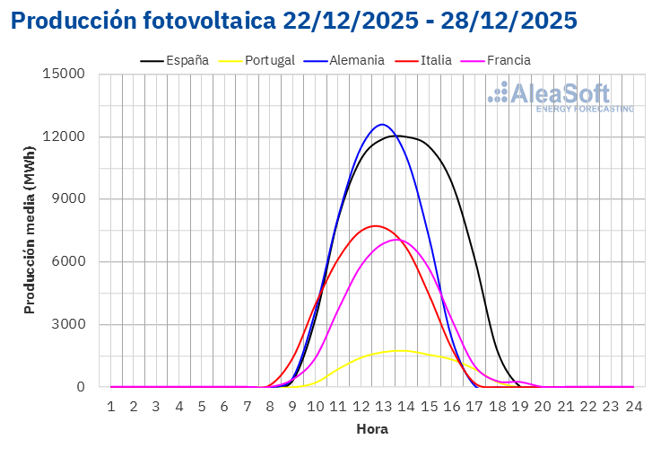 En la semana del 22 de diciembre, la producción solar fotovoltaica aumentó en los principales mercados eléctricos europeos en comparación con la semana anterior. Tras cuatro semanas de descensos, la producción solar aumentó un 48% en el mercado portugués y un 21% en el mercado español. También aumentó un 29% en Italia y un 23% en Francia, tras los descensos de la semana anterior.