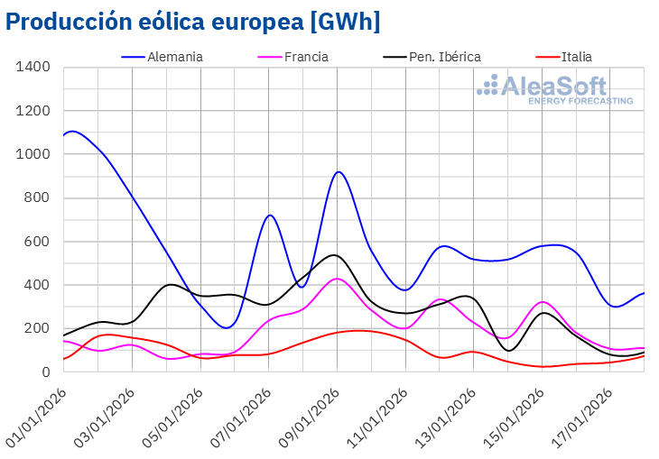 Para la penúltima semana de enero, según las previsiones de producción eólica de AleaSoft Energy Forecasting, la producción con esta tecnología aumentará en los mercados de le península ibérica y de Italia. Sin embargo, se prevé que disminuya en los mercados de Francia y Alemania, continuando con la tendencia a la baja de la semana anterior.