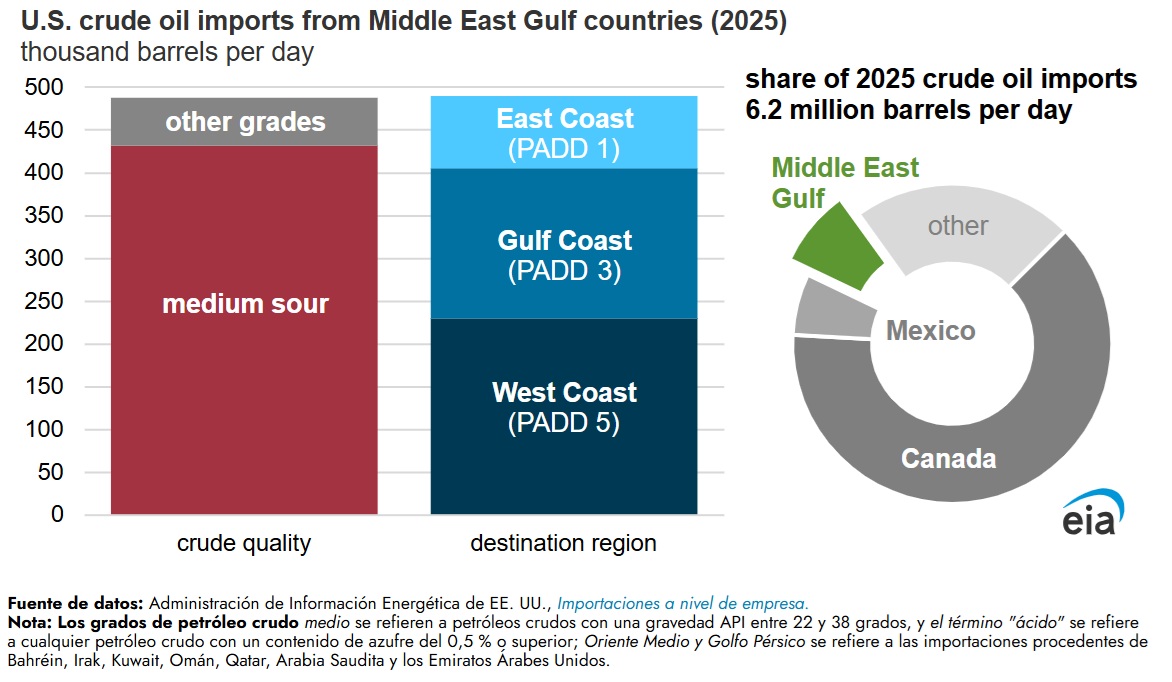 En 2025, Estados Unidos importó un promedio de 490.000 barriles por día (b/d) de petróleo crudo de la región de los países del Golfo -Baréin, Irak, Kuwait, Omán, Catar, Arabia Saudí y los Emiratos Árabes Unidos (EAU)-. Las importaciones de esta región son principalmente de crudos medios y agrios, y se dirigen sobre todo a la costa oeste y la costa del Golfo de Estados Unidos, según la EIA.