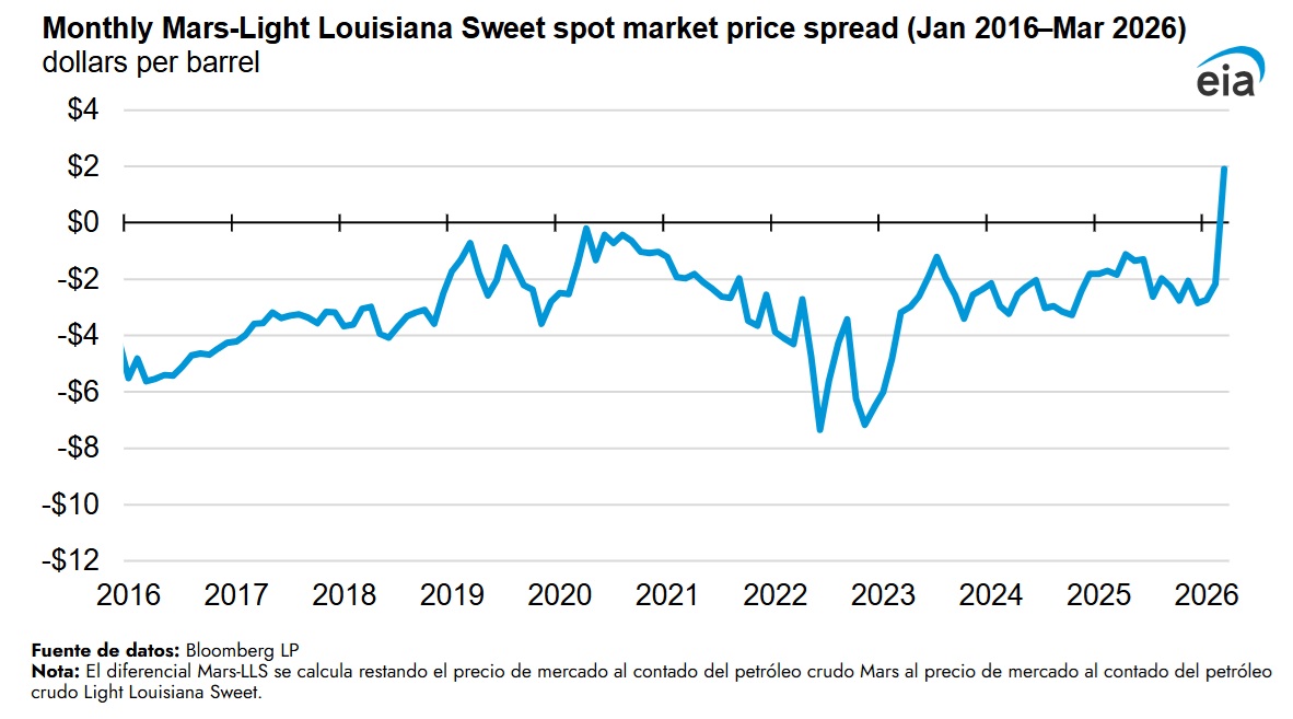 Los mercados al contado del crudo Mars (medio agrio) y del Light Louisiana Sweet (LLS, ligero y dulce) muestran la diferencia de valor entre estos tipos de crudo para la industria de refinación estadounidense. Normalmente, los crudos medios y agrios son más difíciles de refinar, por lo que se venden con descuento respecto a los crudos ligeros y dulces. En 2025, el descuento del Mars respecto al LLS fue de media de 2 dólares por barril (b). Sin embargo, desde marzo, el Mars ha cotizado con una prima de 1 dólar/b frente al LLS debido a interrupciones en el suministro en Oriente Medio.