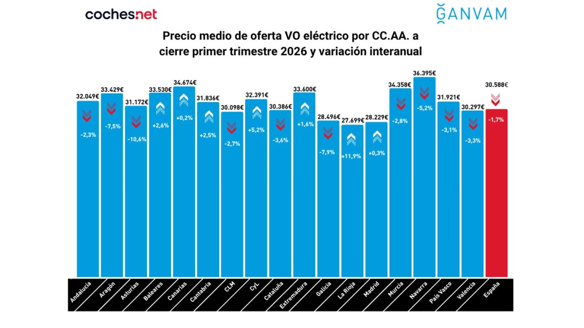 Al cierre del primer trimestre de 2026, en términos exclusivamente porcentuales, en diez comunidades autónomas se producen descensos anuales en el precio del vehículo eléctrico de segunda mano. En algunos casos son caídas bastante pronunciadas, como en Asturias que desciende a doble dígito (-10,6%), Galicia (-7,9%), Aragón (-7,5%) o Navarra (-5,2%).
