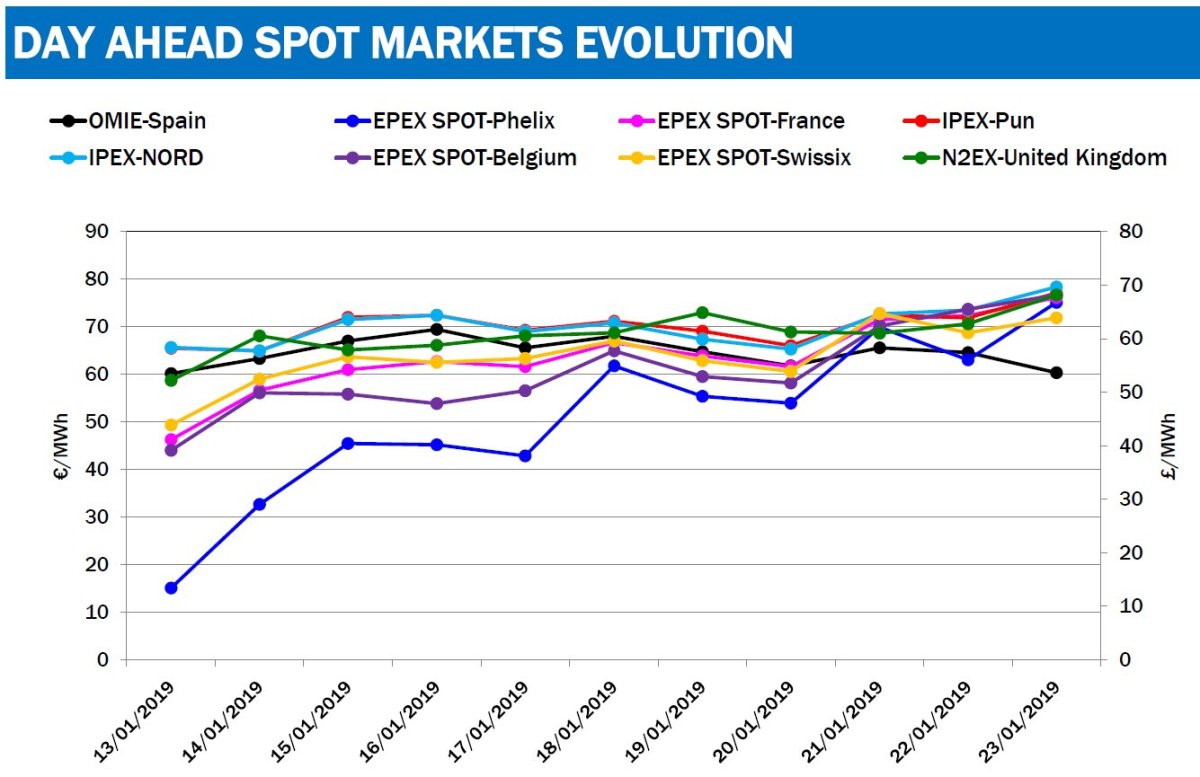Como decía es difícil encontrar una respuesta adecuada a ello. "Las cosas del mercado", me llega a espetar algún experto. Pero una de las posibles causas esté fuera de nuestras fronteras. El frío que azota a Europa ha elevado la demanda eléctrica en todo el Viejo Continente, tanto que a pesar de tener 60 €/MWh, España es el mercado europeo con el precio de la electricidad más bajo de toda Europa, incluso por debajo del mercado Nordpool que marca los precios en los países escandinavos y que normalmente es el más bajo de Europa.