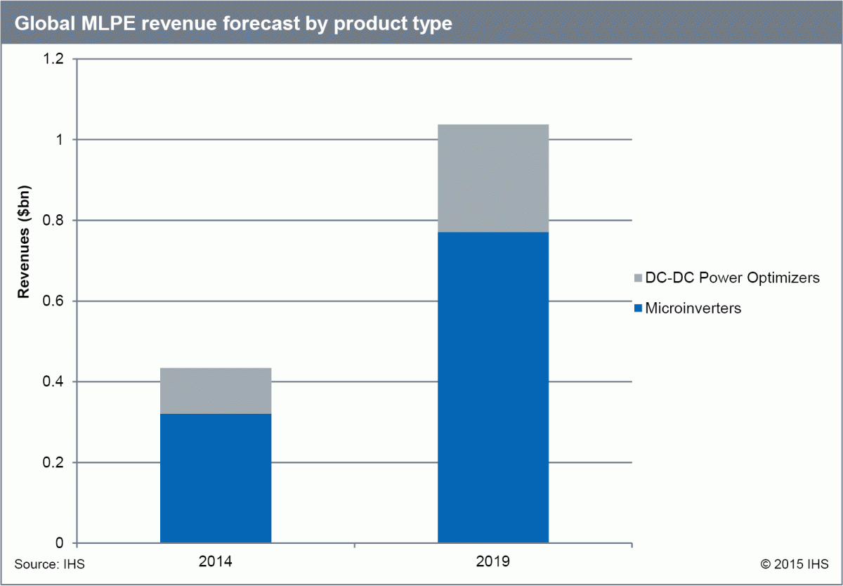 Con una tasa de crecimiento compuesto anual del 19%, el mercado va a llegar a los 1.000 millones en 2019, dijo la analista senior de IHS, Cormac Gilligan. "Estados Unidos sigue siendo el mayor mercado este año", dijo. "Debido al auge de los mercados residenciales y comerciales y un mejor conocimiento por parte del mercado de los beneficios de los microinversores y optimizadores de energía, los proveedores han visto crecer sus ventas”.
