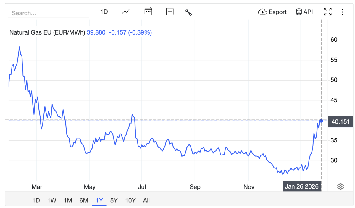 En Europa, la semana anterior, los precios ya habían subido alrededor de un 30 %, impulsados por otra ola de frío combinada con tensiones geopolíticas. Ahora los precios se han ido por encima de los 40 €/MWh, totalmente contagiado por lo que sucede en EEUU.