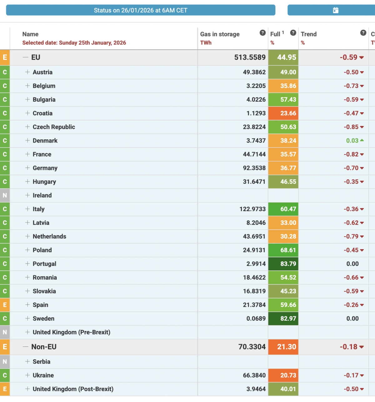 Este movimiento se explica tanto por la fuerte caída de las temperaturas como por el rápido vaciado de los almacenamientos, que han descendido por debajo del 45% en el conjunto de la Unión Europea, el nivel más bajo de los últimos cinco años para estas fechas. En países como Alemania, Francia y los Países Bajos, los niveles se sitúan entre el 30 % y el 45%. En el caso de España, los niveles se sitúan en el 60% aunque nuestras cantidades son pequeñas frente a estos países.