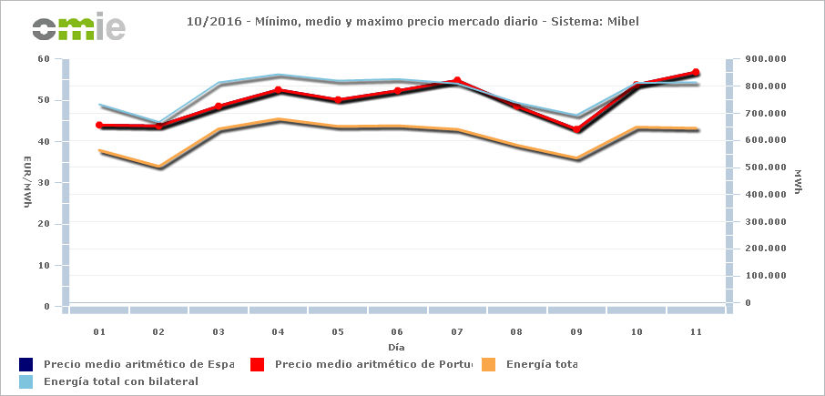 Tres días después, el 10 de octubre, el precio también se marcó un registro histórico de 53,74 euros MWh. El día 4 se lograron los 52,55 euros MWh. También el día 6 se superaron los 52 euros y el día 5 los 50 euros.