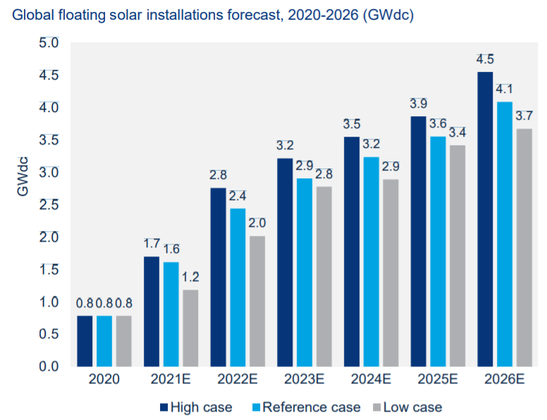 Según un reciente informe de Wood Mackenzie, la demanda mundial de energía fotovoltaica flotante (FPV) crecerá este año un 106%, alcanzando los 1,6 GW, y se prevé que crezca a un ritmo anual del 32% durante el periodo transcurrido entre 2020 y 2026.