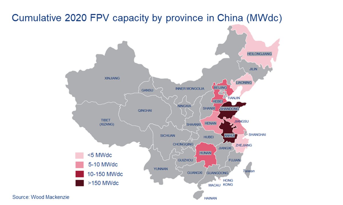 Ubicadas en el este, las provincias de Anhui y Shandong albergan la mayor parte de la capacidad FPV de China a partir de 2020 (ver gráfico a continuación). La buena disponibilidad de suministro de agua, como las minas de carbón inundadas, beneficia enormemente a la tecnología en estas provincias.