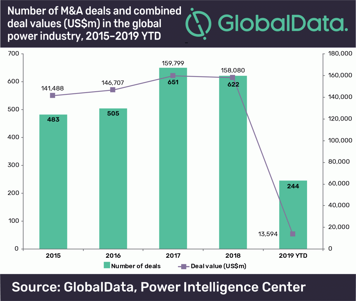 De las 622 transacciones registradas en 2018, 597 fueron adquisiciones, mientras que las 25 restantes fueron fusiones. A partir de 2019 en lo que va de año (YTD), se han registrado 244 acuerdos de fusiones y adquisiciones. El mayor acuerdo anunciado en la industria eléctrica en 2018 fue la adquisición de Innogy por E.ON por 52.900 millones de dólares.
