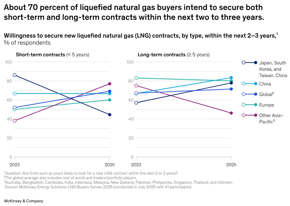 El apetito contractual también evoluciona. Siete de cada diez compradores planean firmar acuerdos tanto a corto como a largo plazo en los próximos dos o tres años. El interés por contratos de corto plazo creció casi 20 puntos porcentuales respecto de 2023, con un fuerte impulso en Asia-Pacífico. Sin embargo, China lidera la intención de cerrar contratos de largo plazo (83 %), seguida por Japón y Corea del Sur (78 %), reflejando una búsqueda de equilibrio entre seguridad de suministro y flexibilidad.