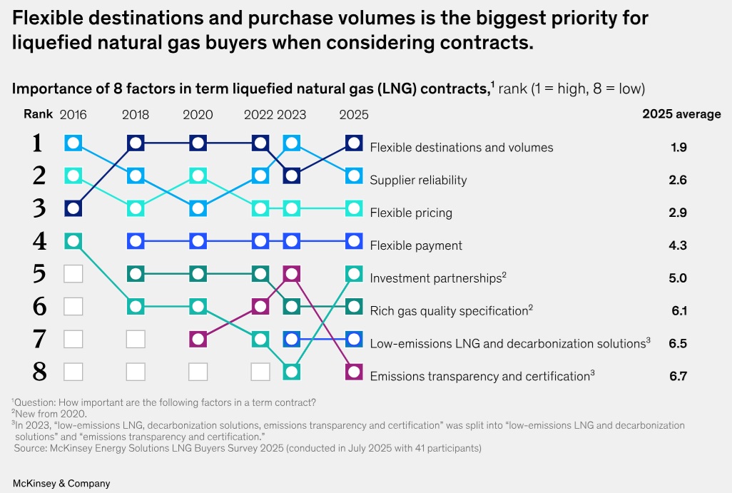 Precisamente, la flexibilidad emerge como el atributo más valorado en los contratos: destinos abiertos y volúmenes ajustables encabezan las prioridades globales. En China, además, cobran relevancia la flexibilidad de precios y las condiciones de pago. Los compradores asiáticos también muestran mayor interés en alianzas de inversión y en GNL de alta calidad energética. En Europa, en cambio, los criterios de sostenibilidad han perdido peso relativo frente a 2023, aunque crece el interés por asociaciones estratégicas en la cadena de valor.