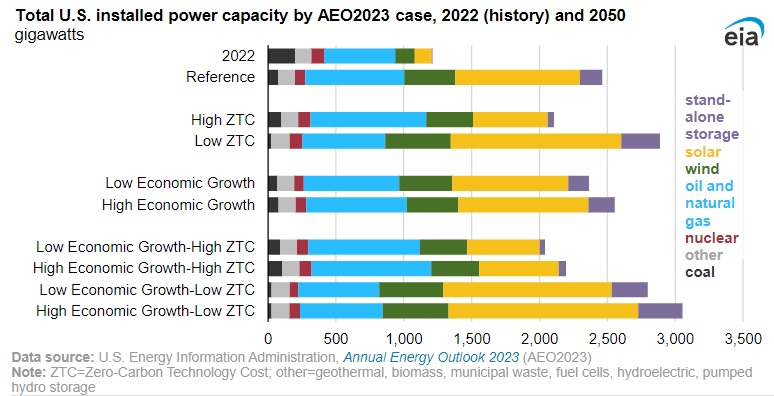 Incluso en el caso combinado de bajo crecimiento económico y alto coste cero de la tecnología del carbono, que supone el menor crecimiento de las tecnologías renovables de todos los casos AEO2023, el crecimiento previsto de la capacidad renovable se acerca al 230%.