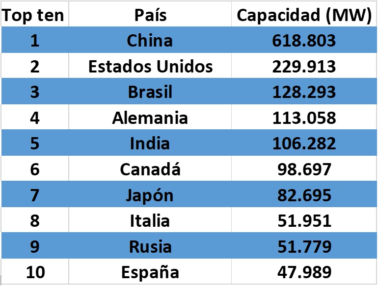 El ‘Top ten’ mundial por capacidad renovable, en el que España figura en décima posición, queda como sigue:
