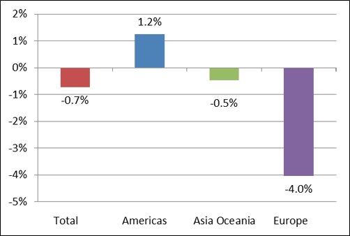 Las reducciones en el consumo más significativas se experimentaron en Holanda (-7%), Francia (-6%), Suiza (-8%) y Reino Unido (-6%), mientras que la media en los países del continente americano pertenecientes a la OCDE subió hasta el 1,2%, liderando EEUU con un 2% positivo.