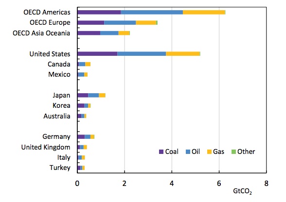 Por el contrario, la proporción de combustibles fósiles en la generación total de electricidad se redujo un 2% en solo ese año, aunque el petróleo sigue siendo el mayor causante de las emisiones de CO2, cuya producción aumentó en EEUU y Canadá. Según el informe, supone el 40% de las emisiones en 2014, seguido del carbón (33%) y el gas (26%). Es decir, que el carbón, que representa el 19% del Suministro total de energía primaria (TPES) de la OCDE, suponen el 33% de las emisiones de CO2 debido a su contenido de carbono pesado por unidad de energía liberada.